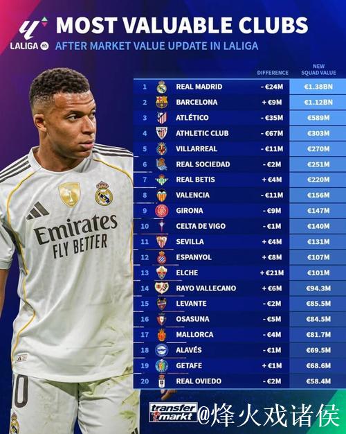 德转西甲俱乐部身价排名:皇马13.8亿第1,最低奥维耶多5840万